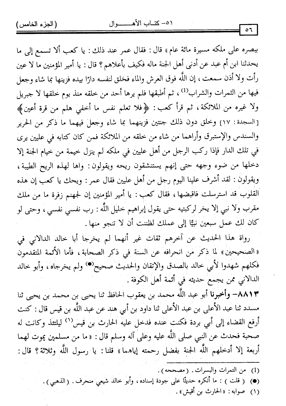 8813 - أَخْبَرَنَا أَبُو عَبْدِ اللَّهِ مُحَمَّدُ بْنُ يَعْقُوبَ الْحَافِظُ ، ثَنَا يَحْيَى بْنُ مُحَمَّدِ بْنِ يَحْيَى ، ثَنَا مُسَدَّدٌ ، ثَنَا عَبْدُ الْأَعْلَى بْنُ عَبْدِ الْأَعْلَى ، ثَنَا دَاوُدُ بْنُ أَبِي هِنْدٍ ، عَنْ عَبْدِ اللَّهِ بْنِ قَيْسٍ ، قَالَ: كُنْتُ أَرْفَعُ الْقَضَاءَ إِلَى أَبِي بُرْدَةَ ، فَكُنْتُ عِنْدَهُ فَدَخَلَ عَلَيْهِ الْحَارِثُ بْنُ قَيْسٍ لَيْلَتَئِذٍ وَكَانَتْ لَهُ صُحْبَةٌ ، فَحَدَّثَ عَنِ النَّبِيِّ صَلَّى اللَّهُ عَلَيْهِ وَسَلَّمَ ، قَالَ: " مَا مِنْ مُسْلِمَيْنِ يَمُوتُ لَهُمَا أَرْبَعَةٌ إِلَّا أَدْخَلَهُمُ اللَّهُ الْجَنَّةَ بِفَضْلِ رَحْمَتِهِ إِيَّاهُمَا " قُلْنَا: يَا رَسُولَ اللَّهِ وَثَلَاثَةٌ ؟ قَالَ: -[57]- " وَثَلَاثَةٌ " قُلْنَا: يَا رَسُولَ اللَّهِ وَاثْنَانِ ، قَالَ: " وَاثْنَانِ " ثُمَّ قَالَ: " إِنَّ مِنْ أُمَّتِي لَمَنْ يُعَظَّمُ فِي النَّارِ حَتَّى يَكُونَ أَحَدَ زَوَايَاهَا ، وَإِنَّ مِنْ أُمَّتِي لَمَنْ يَدْخُلُ بِشَفَاعَتِهِ الْجَنَّةَ أَكْثَرُ مِنْ مُضَرَ "