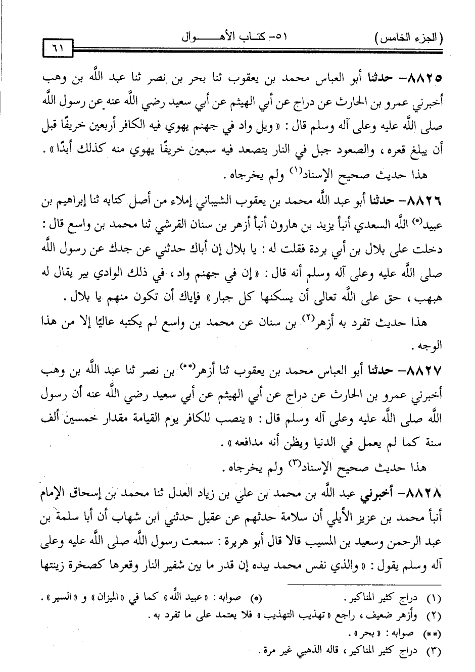8825 - حَدَّثَنَا أَبُو الْعَبَّاسِ مُحَمَّدُ بْنُ يَعْقُوبَ ، ثَنَا بَحْرُ بْنُ نَصْرٍ ، ثَنَا عَبْدُ اللَّهِ بْنُ وَهْبٍ ، أَخْبَرَنِي عَمْرُو بْنُ الْحَارِثِ ، عَنْ دَرَّاجٍ ، عَنْ أَبِي الْهَيْثَمِ ، عَنْ أَبِي سَعِيدٍ رَضِيَ اللَّهُ عَنْهُ ، عَنْ رَسُولِ اللَّهِ صَلَّى اللَّهُ عَلَيْهِ وَسَلَّمَ ، قَالَ: " وَيْلً وَادٍ فِي جَهَنَّمَ يَهْوِي فِيهِ الْكَافِرُ أَرْبَعِينَ خَرِيفًا قَبْلَ أَنْ يَبْلُغَ قَعْرَهُ ، وَالصَّعُودُ جَبَلٌ فِي النَّارِ يَتَصَعَّدُ فِيهِ سَبْعِينَ خَرِيفًا يَهْوِي مِنْهُ كَذَلِكَ أَبَدًا "