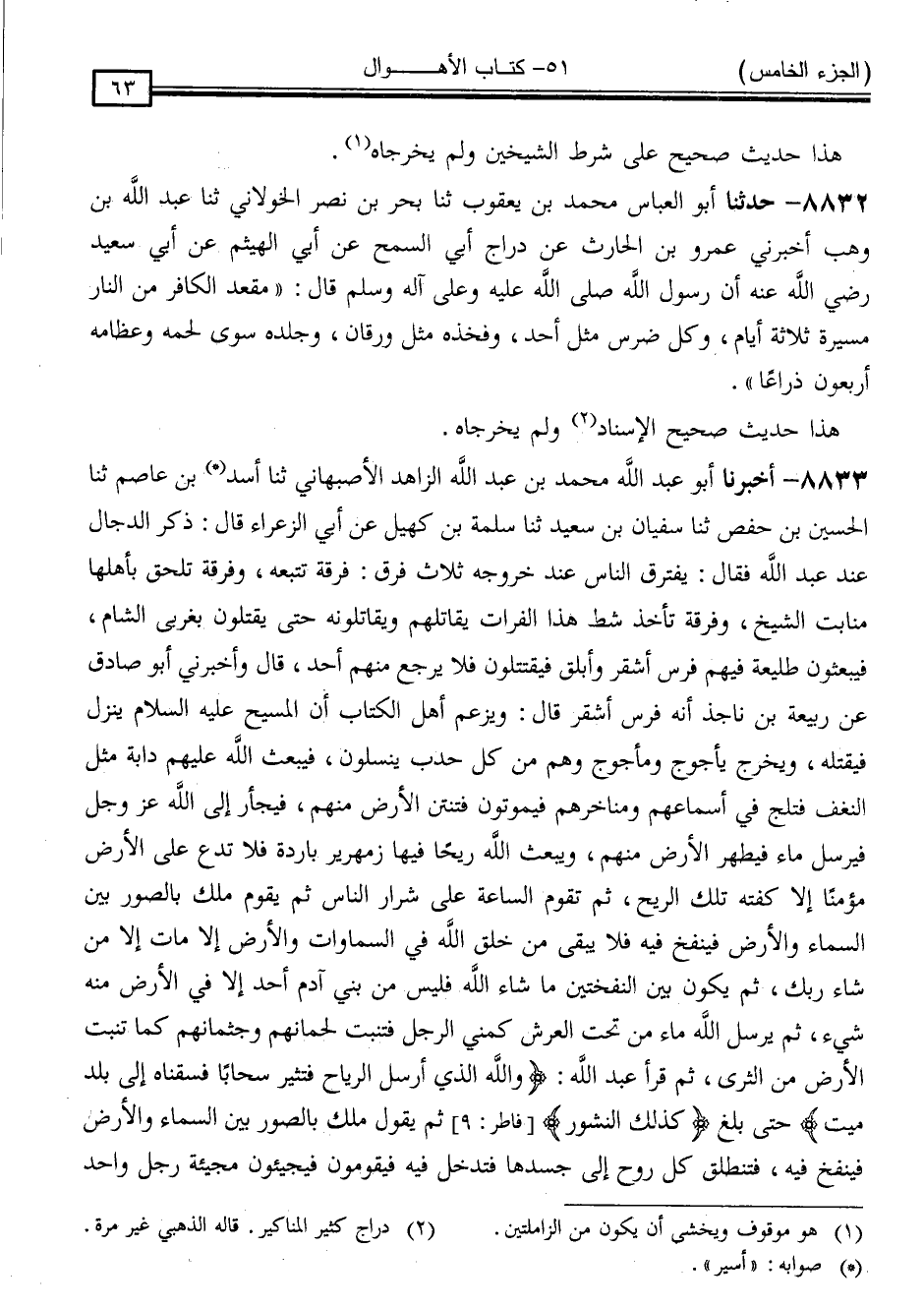 8832 - حَدَّثَنَا أَبُو الْعَبَّاسِ مُحَمَّدُ بْنُ يَعْقُوبَ ، ثَنَا بَحْرُ بْنُ نَصْرٍ الْخَوْلَانِيُّ ، ثَنَا عَبْدُ اللَّهِ بْنُ وَهْبٍ ، أَخْبَرَنِي عَمْرُو بْنُ الْحَارِثِ ، عَنْ دَرَّاجٍ أَبِي السَّمْحِ ، عَنْ أَبِي الْهَيْثَمِ ، عَنْ أَبِي سَعِيدٍ رَضِيَ اللَّهُ عَنْهُ ، أَنَّ رَسُولَ اللَّهِ صَلَّى اللَّهُ عَلَيْهِ وَسَلَّمَ ، قَالَ: " مَقْعَدُ الْكَافِرِ مِنَ النَّارِ مَسِيرَةُ ثَلَاثَةِ أَيَّامٍ ، وَكُلُّ ضِرْسٍ مِثْلُ أُحُدٍ ، وَفَخِذُهُ مِثْلُ وَرِقَانَ ، وَجِلْدُهُ سِوَى لَحْمِهِ وَعِظَامِهِ أَرْبَعُونَ ذِرَاعًا "