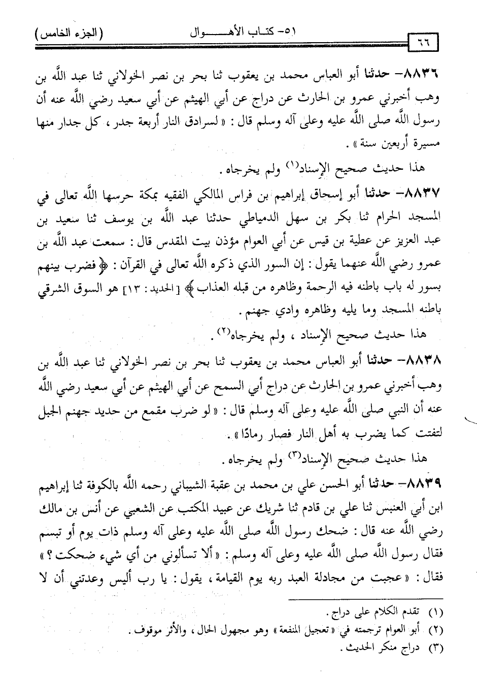 8836 - حَدَّثَنَا أَبُو الْعَبَّاسِ مُحَمَّدُ بْنُ يَعْقُوبَ ، ثَنَا بَحْرُ بْنُ نَصْرٍ الْخَوْلَانِيُّ ، ثَنَا عَبْدُ اللَّهِ بْنُ وَهْبٍ ، أَخْبَرَنِي عَمْرُو بْنُ الْحَارِثِ ، عَنْ دَرَّاجٍ ، عَنْ أَبِي الْهَيْثَمِ ، عَنْ أَبِي سَعِيدٍ رَضِيَ اللَّهُ عَنْهُ ، أَنَّ رَسُولَ اللَّهِ صَلَّى اللَّهُ عَلَيْهِ وَسَلَّمَ ، قَالَ: " لَسُرَادِقُ النَّارِ أَرْبَعَةُ جُدُرٍ كُلُّ جِدَارٍ مِنْهَا مَسِيرَةُ أَرْبَعِينَ سَنَةً "