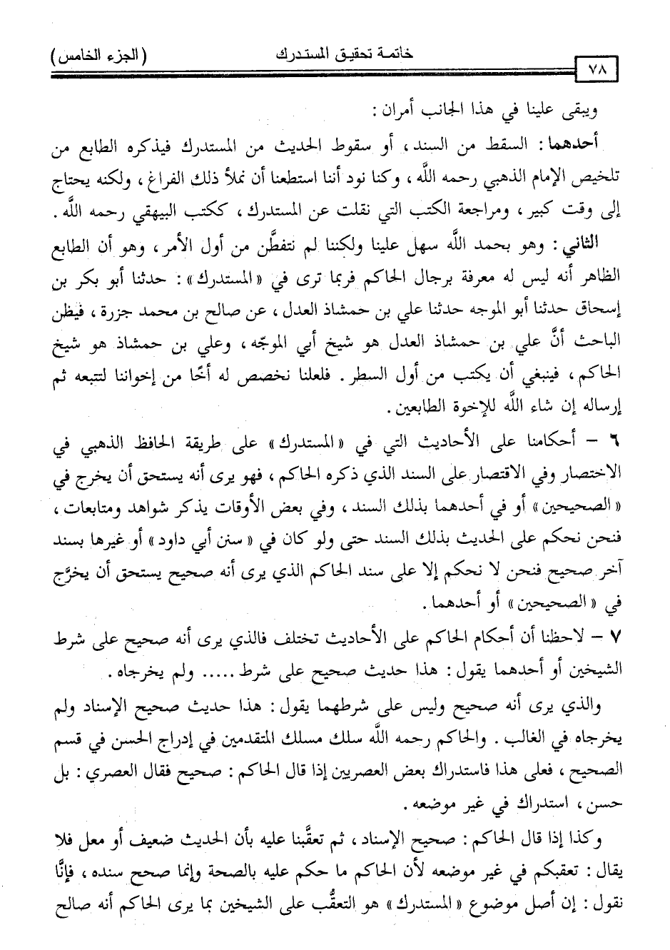 6 - أحكامنا على الأحاديث التي في "المستدرك" على طريقة الحافظ الذهبي في الاختصار وفي الاقتصار على السند الذي ذكره الحاكم ، فهو يرى أنه يستحق أن يخرج في "الصحيحين" أو في أحدهما بذلك السند ، وفي بعض الأوقات يذكر شواهد ومتابعات ، فنحن نحكم على الحديث بذلك السند حتى ولو كان في "سنن أبي داود" أو غيرها بسند آخر صحيح فنحن لا نحكم إلا على سند الحاكم الذي يرى أنه صحيح يستحق أن يخرَّج في الصحيحين أو أحدهما .