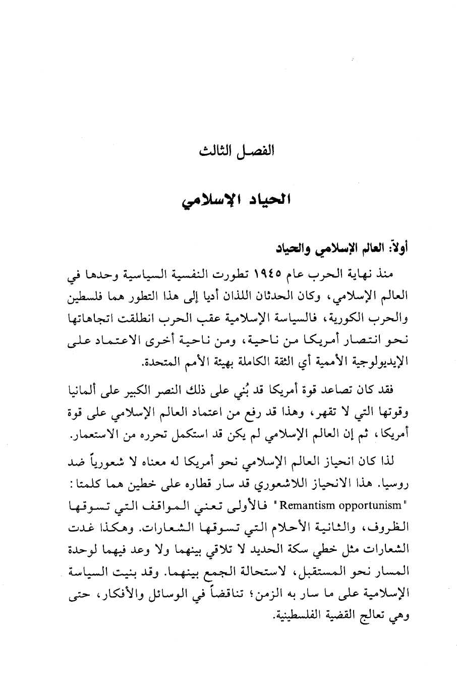 لذا كان انحياز العالم الإسلامي نحو أمريكا له معناه لا شعوريا ضد روسيا. هذا الانحياز اللاشعوري قد سار قطاره على خطين هما كلمتا: (Remantism opportunism) فالأولى تعني المواقف التي تسوقها الظروف، والثانية الأحلام التي تسوقها الشعارات. وهكذا غدت الشعارات مثل خطي سكة الحديد لا تلاقي بينهما ولا وعد فيهما لوحدة المسار نحو المستقبل، لاستحالة الجمع بينهما. وقد بنيت السياسة الإسلامية على ما سار به الزمن؛ تناقضا في الوسائل والأفكار، حتى وهي تعالج القضية الفلسطينية.