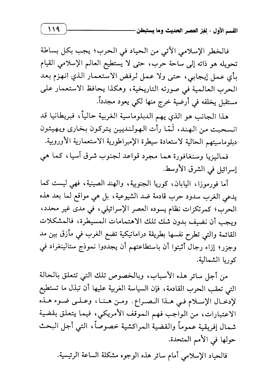 فالخطر الإسلامي الآتي من الحياد في الحرب؛ يجب بكل بساطة تحويله هو ذاته إلى ساحة حرب، حتى لا يستطيع العالم الإسلامي القيام بأي عمل إيجابي، حتى ولا عمل لرفض الاستعمار الذي انهزم بعد الحرب العالمية في صورته التاريخية، وهكذا يحافظ الاستعمار على مستقبل يخلفه في أرضية خرج منها لكي يعود مجددا.