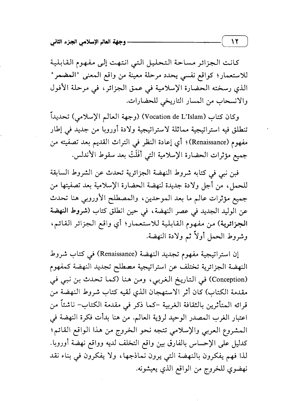 وكان كتاب (Vocation de L'islam) (وجهة العالم الإسلامي) تحديدا تنطلق فيه استراتيجية مماثلة لاستراتيجية ولادة أوروبا من جديد فى إطار مفهوم (Renaissance)؛ أي إعادة النظر في التراث القديم بعد تصفيته من جميع مؤثرات الحضارة الإسلامية التي أفلت بعد سقوط الأندلس.