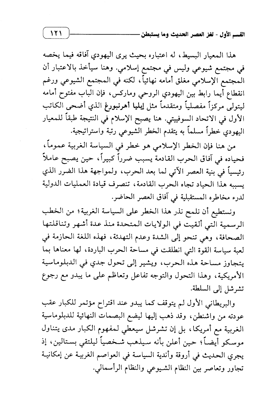 ونستطيع أن نلمح نذر هذا الخطر على السياسة الغربية؛ من الخطب الرسمية التي ألقيت في الولايات المتحدة منذ عدة أشهر وتناقلتها الصحافة، وهي تنحو إلى الشدة وعدم التهدئة، فهذه اللغة الحازمة في لعبة سياسة القوة التي انطلقت في مساحة الحرب الباردة، لها معناها بما يتجاوز مساحة هذه الحرب، ويشير إلى تحول جدي في الدبلوماسية الأمريكية، وهذا التحول والتوجه تفاعل وتعاظم على ما يبدو مع رجوع تشرشل إلى السلطة.