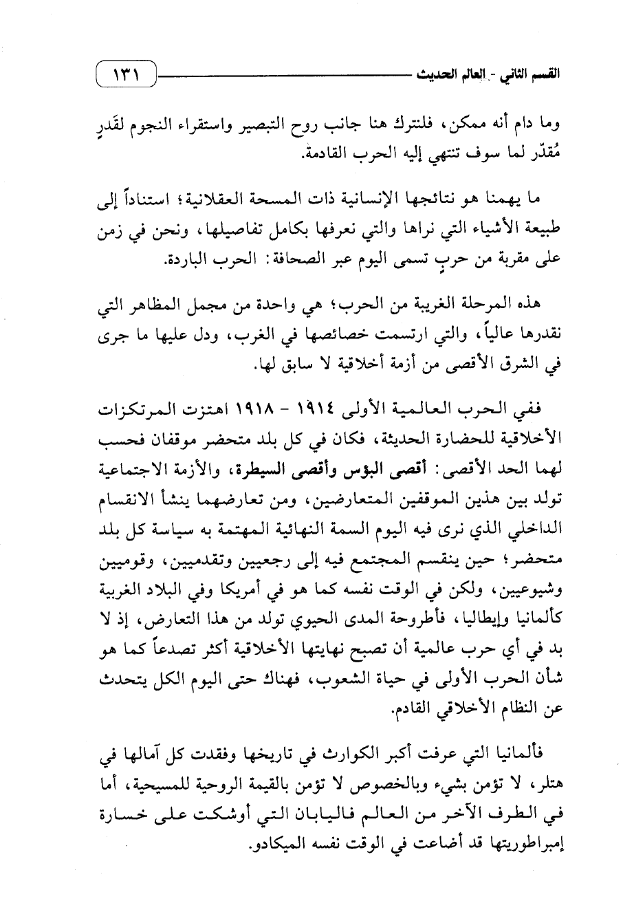 وشيوعيين، ولكن في الوقت نفسه كما هو في أمريكا وفي البلاد الغربية كألمانيا وإيطاليا، فأطروحة المدى الحيوي تولد من هذا التعارض، إذ لا بد في أي حرب عالمية أن تصبح نهايتها الأخلاقية أكثر تصدعا كما هو شأن الحرب الأولى في حياة الشعوب، فهناك حتى اليوم الكل يتحدث عن النظام الأخلاقي القادم.