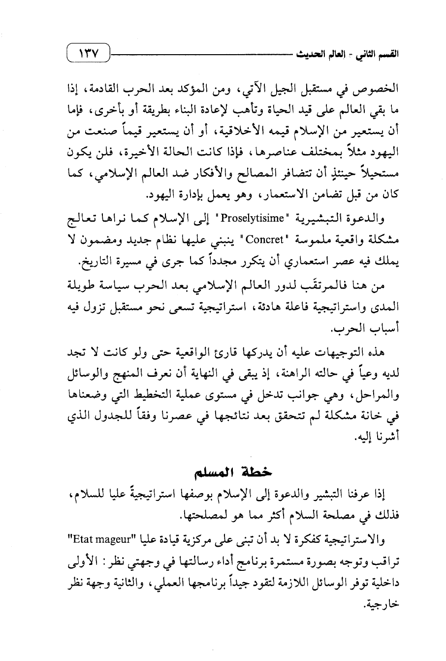 والدعوة التبشيرية (Proselytisime) إلى الإسلام كما نراها تعالج مشكلة واقعية مسلمومعة (Concret) ينبني عليها نظام جديد ومضمون لا يملك فيه عصر استعماري أن يتكرر مجددا كما جرى في مسيرة التاريخ.