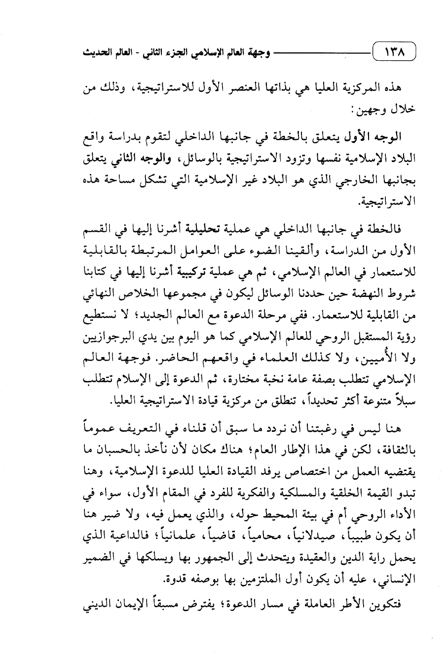 رؤية المستقبل الروحي للعالم الإسلامي كما هو اليوم بين يدي البرجوازيين ولا الأميين، ولا كذلك العلماء في واقعهم الحاضر. فوجهة العالم الإسلامي تتطلب بصفة عامة نخبة مختارة، ثم الدعوة إلى الإسلام تتطلب سبلا متنوعة أكثر تحديدا، تنطلق من مركزية قيادة الاستراتيجية العليا.