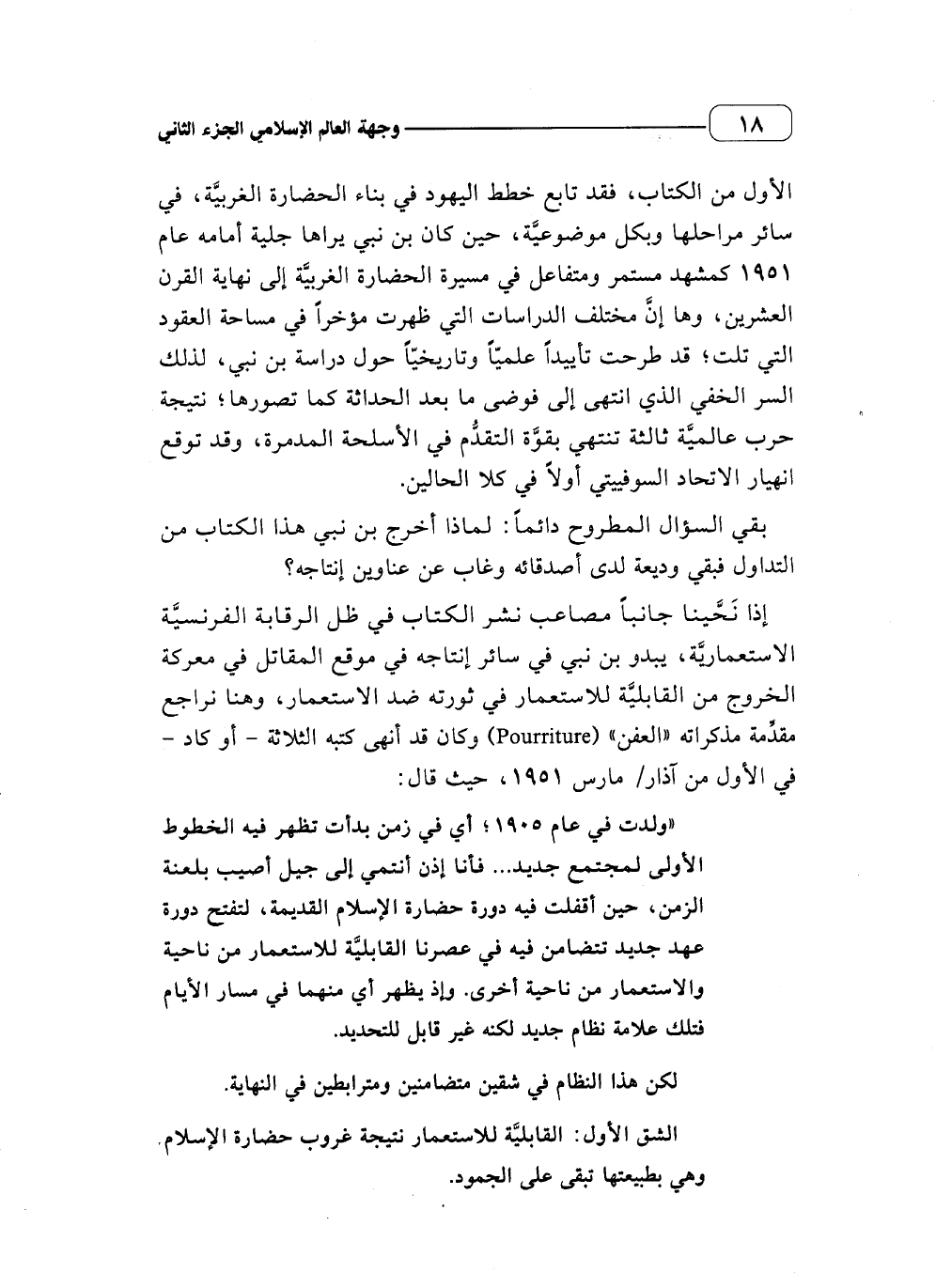 (ولدت في عام 1905؛ أي في زمن بدأت تظهر فيه الخطوط الأولى لمجتمع جديد ... فأنا إذن أنتمي إلى جيل أصيب بلعنة الزمن، حين أقفلت فيه دورة حضارة الإسلام القديمة، لتفتح دورة عهد جديد تتضامن فيه في عصرنا القابلية للاستعمار من ناحية والاستعمار من ناحية أخرى. وإذ يظهر أي منهما في مسار الأيام فتلك علامة نظام جديد لكنه غير قابل للتحديد.