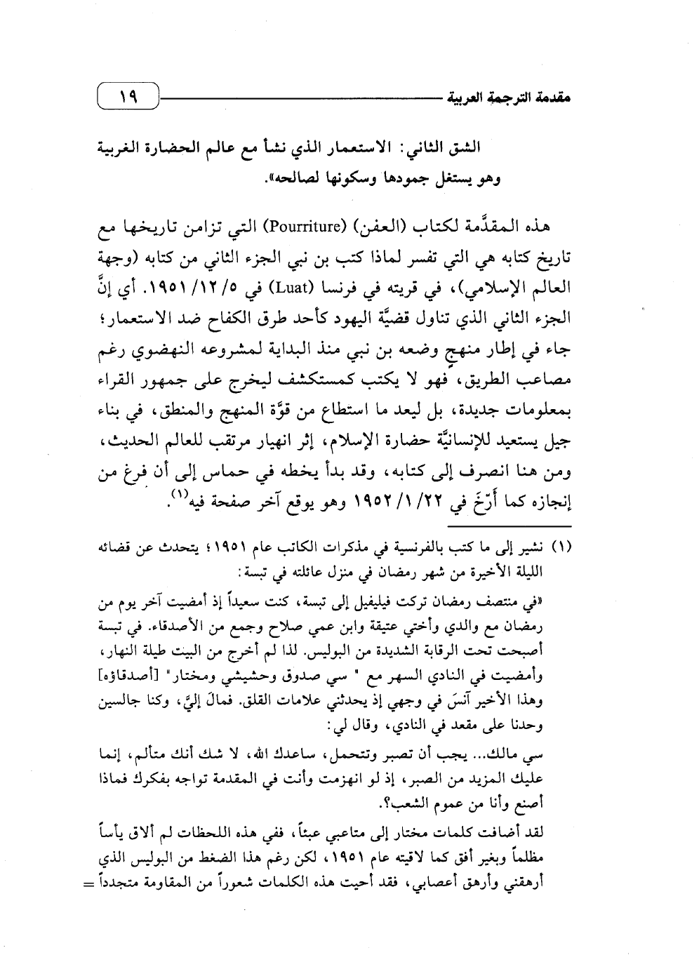 تاريخ كتابه هي التي تفسر لماذا كتب بن نبي الجزء الثاني من كتابه (وجهة العالم الإسلامي)، في قريته في فرنسا (Luat) في 5/ 12/ 1951. أي إن الجزء الثاني الذي تناول قضية اليهود كأحد طرق الكفاح ضد الاستعمار؛ جاء في إطار منهج وضعه بن نبي منذ البداية لمشروعه النهضوي رغم مصاعب الطريق، فهو لا يكتب كمستكشف ليخرج على جمهور القراء بمعلومات جديدة، بل ليعد ما استطاع من قوة المنهج والمنطق، في بناء جيل يستعيد للإنسانة حضارة الإسلام، إثر انهيار مرتقب للعالم الحديث، ومن هنا انصرف إلى كتابه، وقد بدأ يخطه في حماس إلى أن فرغ من إنجازه كما أرخ في 22/ 1/ 1952 وهو يوقع آخر صفحة فيه (¬1).