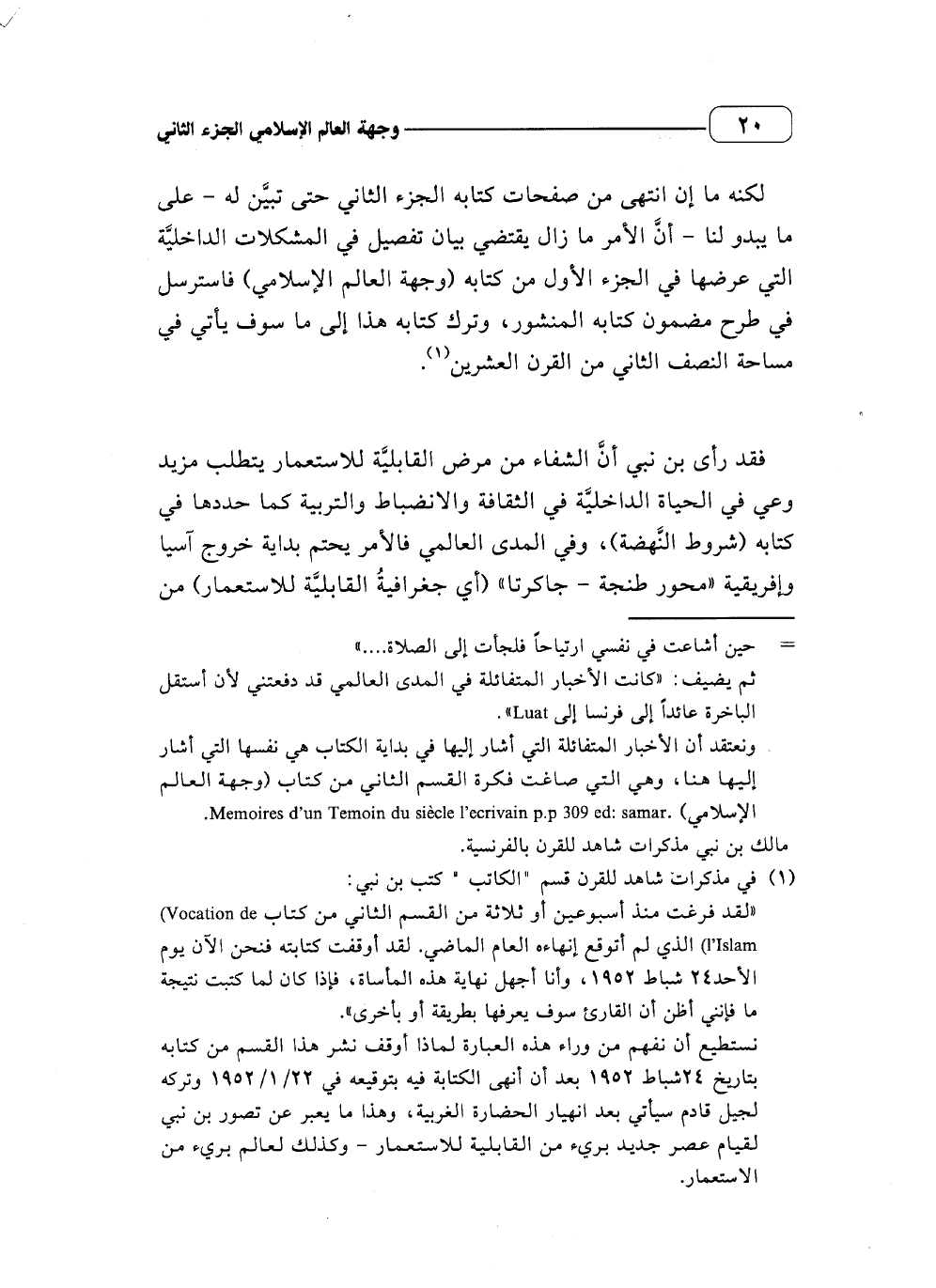 (لقد فرغت منذ أسبوعين أو ثلاثة من القسم الثاني من كتاب Vocation de) l'Islam) الذي لم أتوقع إنهاءه العام الماضي. لقد أوقفت كتابته فنحن الآن يوم الأحد 24 شباط 1952، وأنا أجهل نهاية هذه المأساة، فإذا كان لما كبت نتيجة ما فإنني أظن أن القارئ سوف يعرفها بطريقة أو بأخرى). نستطيع أن نفهم من وراء هذه العبارة لماذا أوقف نشر هذا القسم من كتابه بتاريخ 24 شباط 1952 بعد أن أنهى الكتابة فيه بتوقيعه في 22/ 1/ 1952 وتركه لجيل قادم سيأتي بعد انهيار الحضارة الغربية، وهذا ما يعبر عن تصور بن نبي لقيام عصر جديد بريء من القابلية للاستعمار - وكذلك لعالم بريء من الاستعمار.