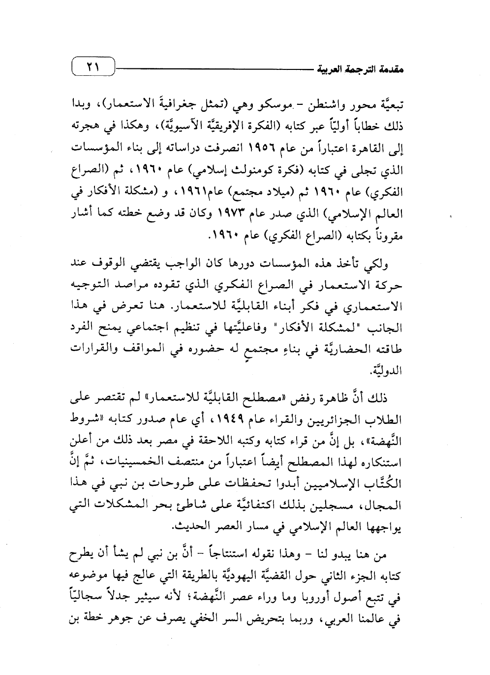 تبعية محور واشنطن - موسكو وهي (تمثل جغرافية الاستعمار)، وبدا ذلك خطابا أوليا عبر كتابه (الفكرة الإفريقية الآسيوية)، وهكذا في هجرته إلى القاهرة اعتبارا من عام 1956 انصرفت دراساته إلى بناء المؤسسات الذي تجلى في كتابه (فكرة كومنولث إسلامي) عام 1960، ثم (الصراع الفكري) عام 1960 ثم (ميلاد مجتمع) عام 1961، و (مشكلة الأفكار في العالم الإسلامي) الذي صدر عام 1973 وكان قد وضع خطته كما أشار مقرونا بكتابه (الصرع الفكري) عام 1960.