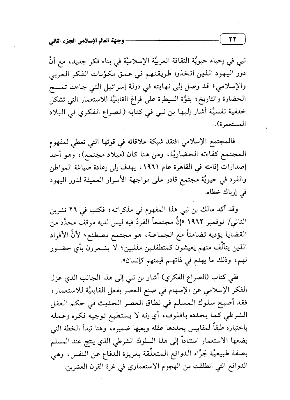 نبي في إحياء حيوية الثقافة العربية الإسلامية في بناء فكر جديد، مع أن دور اليهود الذين اتخذوا طريقتهم في عمق مكونات الفكر العربي والإسلامي؛ قد وصل إلى نهايته في دولة إسرائيل التي جاءت تمسح