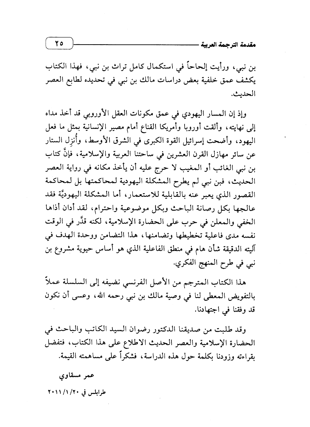 هذا الكتاب المترجم من الأصل الفرنسي نضيفه إلى السلسلة عملا بالتفويض المعطى لنا في وصية مالك بن نبي رحمه الله، وعسى أن نكون قد وفقنا في اجتهادنا.