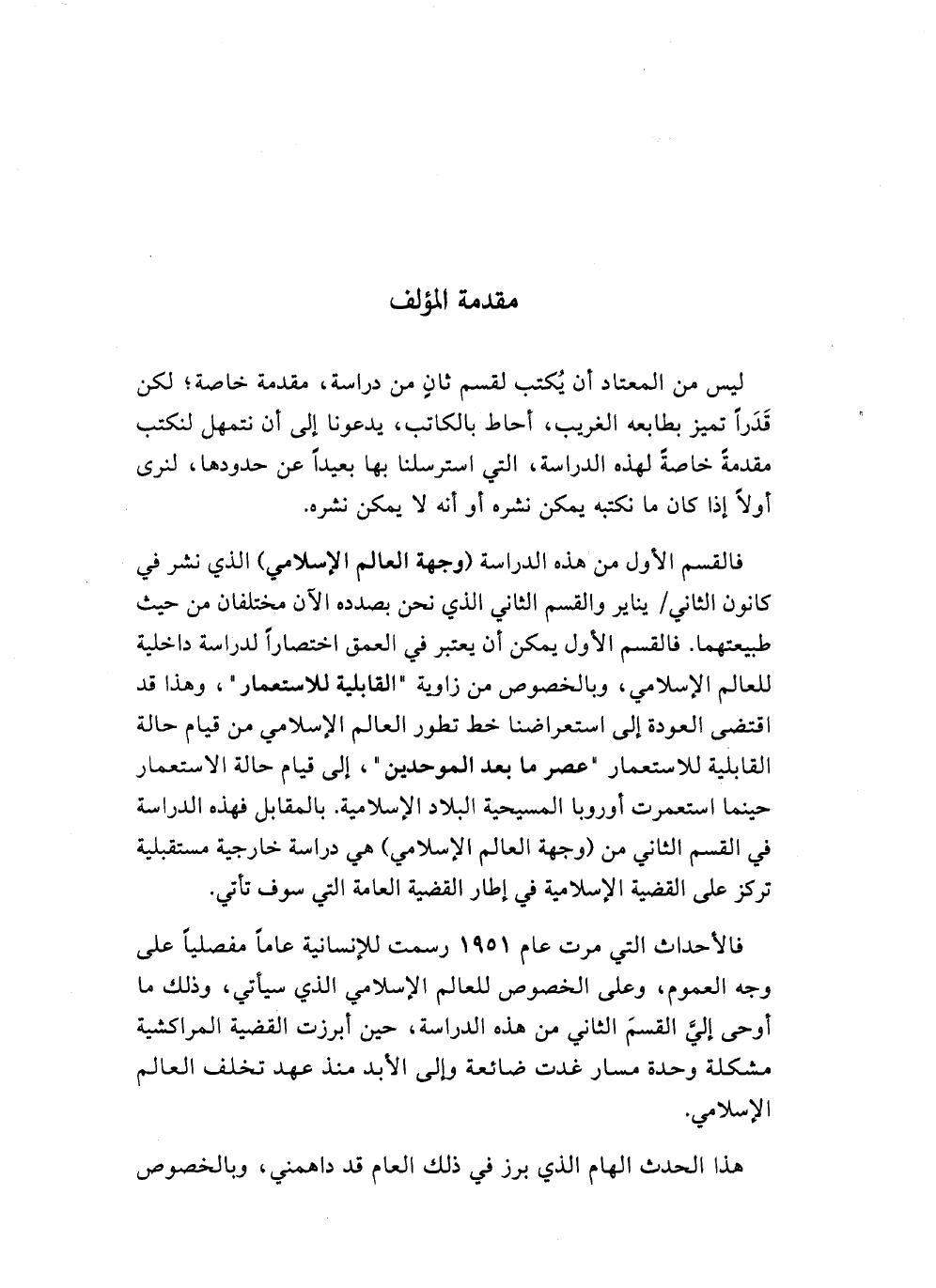 فالقسم الأول من هذه الدراسة (وجهة العالم الإسلامي) الذي نشر في كانون الثاني/ يناير والقسم الثاني الذي نحن بصدده الآن مختلفان من حيث طبيعتهما. فالقسم الأول يمكن أن يعتبر في العمق اختصارا لدراسة داخلية للعالم الإسلامي، وبالخصوص من زاوية (القابلية للاستعمار)، وهذا قد اقتضى العودة إلى استعراضنا خط تطور العالم الإسلامي من قيام حالة القابلية للاستعمار (عصر ما بعد الموحدين)، إلى قيام حالة الاستعمار حينما استعمرت أوروبا المسيحية البلاد الإسلامية. بالمقابل فهذه الدراسة في القسم الثاني من (وجهة العالم الإسلامي) هي دراسة خارجية مستقبلية تركز على القضية الإسلامية في إطار القضية العامة التي سوف تأتي.