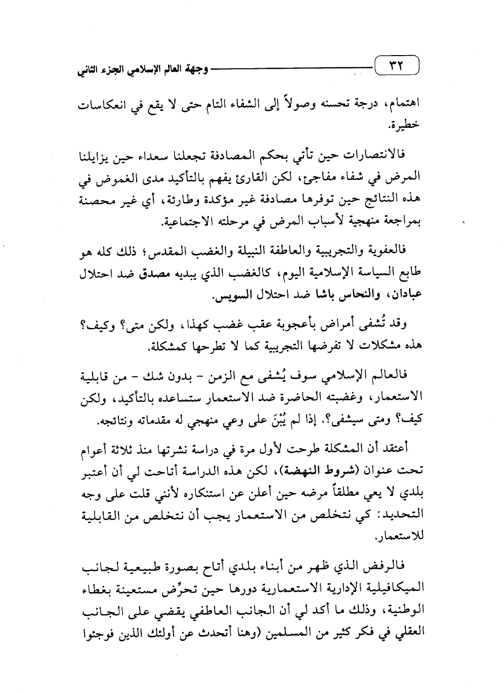 فالعالم الإسلامي سوف يشفى مع الزمن - بدون شك - من قابلية الاستعمار، وغضبته الحاضرة ضد الاستعمار ستساعده بالتأكيد، ولكن كيف؟ ومتى سيشفى؟. إذا لم يبن على وعي منهجي له مقدماته ونتائجه.