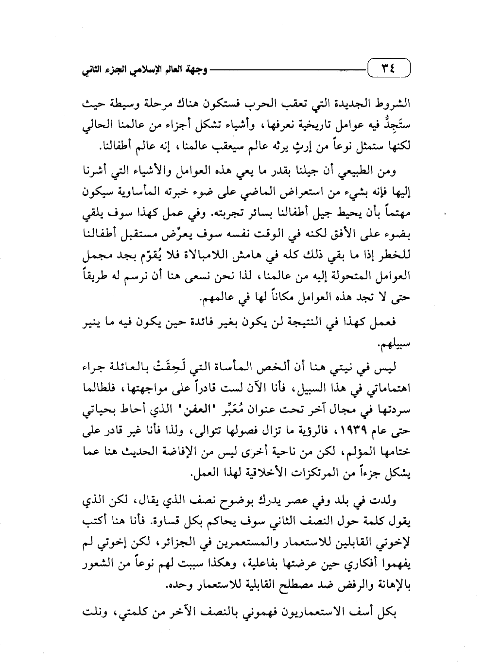 ولدت في بلد وفي عمر يدرك بوضوح نصف الذي يقال، لكن الذي يقول كلمة حول النصف الثاني سوف يحاكم بكل قساوة. فأنا هنا أكتب لإخوتي القابلين للاستعمار والمستعمرين في الجزائر، لكن إخوتي لم يفهموا أفكاري حين عرضتها بفاعلية، وهكذا سببت لهم نوعا من الشعور بالإهانة والرفض ضد مصطلح القابلية للاستعمار وحده.