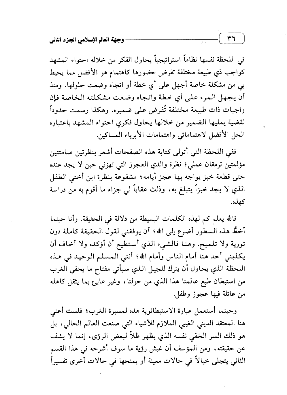 فالله يعلم كم لهذه الكلمات البسيطة من دلالة في الحقيقة. وأنا حينما أخط هذه السطور أضرع إلى الله؛ أن يوفقني لقول الحقيقة كاملة دون تورية ولا تلميح. وهنا فالشيء الذي أستطيع أن أؤكده ولا أخاف أن يكذبني أحد هنا أمام الناس وأمام الله؛ أنني المسلم الوحيد في هذه اللحظة الذي يحاول أن يترك للجيل الذي سيأتي مفتاح ما يخفي الغرب من استبطان طبع عالمنا هذا الذي من حولنا، وغير عابئ بما يثقل كاهله