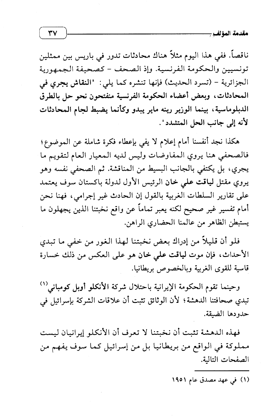 فالصحفي هنا يروي المفاوضات وليس لديه المعيار العام لتقويم ما يجري، بل يكتفي بالجانب البسيط من المناقشة. ثم الصحفي نفسه وهو يروي مقتل لياقت علي خان الرئيس الأول لدولة باكستان سوف يعتمد على تقارير السلطات الغربية بالقول إن الحادث غير إجرامي، فهنا نحن أمام تفسير غير صحيح لكنه يعبر تماما عن واقع نخبتنا الذين يجهلون ما يستبطن الظاهر من عالمنا الحضاري الراهن.