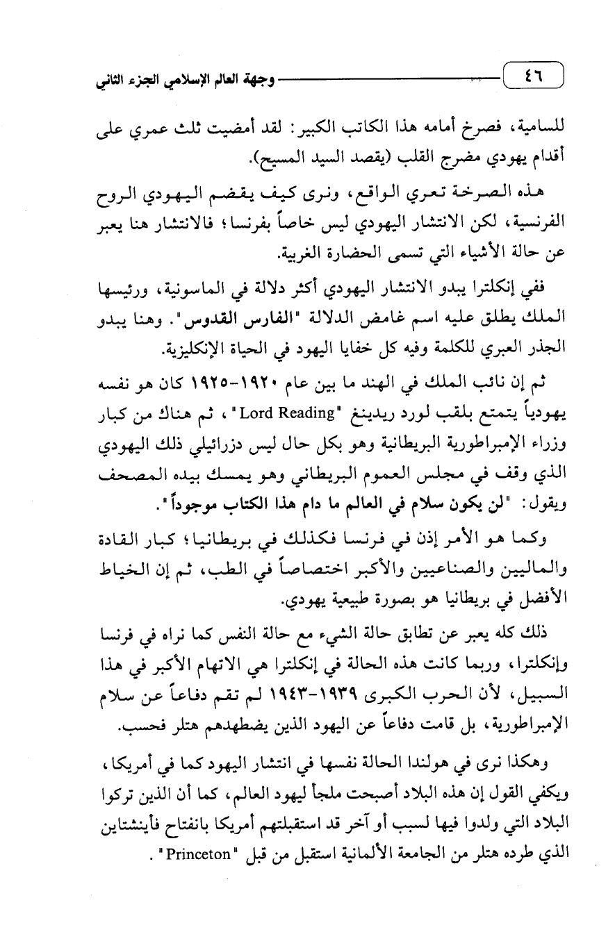 ففي إنكلترا يبدو الانتشار اليهودي أكثر دلالة في الماسونية، ورئيسها الملك يطلق عليه اسم غامض الدلالة (الفارس القدوس). وهنا يبدو الجذر العبري للكلمة وفيه كل خفايا اليهود في الحياة الإنكليزية.