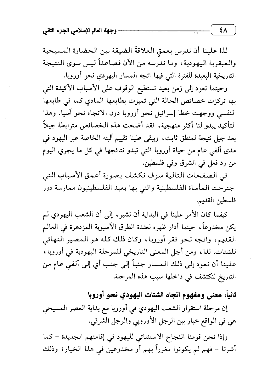 وحينما نعود إلى زمن بعيد نستطيع الوقوف على الأسباب الأكيدة التي بها تركزت خصائص الحالة التي تميزت بطابعها المادي كما في طابعها النفسي ووجهت خطا إسرائيل نحو أوروبا دون الاتجاه نحو آسيا. وهذا التأكيد يبدو لنا أكثر منهجية، فقد أضحت هذه الخصائص مترابطة جيلا بعد جيل نتيجة لمنطق ثابت، ويبقى علينا تقييم آليته الخاصة عبر اليهود في