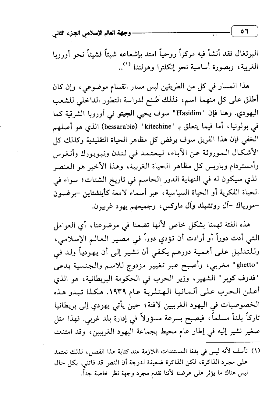 البرتغال فقد أنشأ فيه مركزا روحيا امتد بإشعاعه شيئا فشيئا نحو أوروبا الغربية، وبصورة أساسية نحو إنكلترا وهولندا (¬1) .. هذا المسار في كل من الطريقين ليس مسار انقسام موضوعي، وإن كان أطلق على كل منهما اسم، فذلك صنع لدراسة التطور الداخلي للشعب اليهودي. وهنا فإن (Hasidim) سوف يحيي الجيتو في أوروبا الشرقية كما في بولونيا، أما فيما يتعلق ب (bessarabie))kitechine) الذي هو أصلهم الخفي فإن هذا الفريق سوف يرفض كل مظاهر الحياة التقليدية وكذلك كل الأشكال الموروثة عن الآباء، ليعتمد في لندن ونيويورك وأنغرس وأمستردام وباريس كل مظاهر الحياة الغربية، وهذا الأخير هو العنصر الذي سيكون له في النهاية الدور الحاسم في تاريخ الشتات؛ سواء في الحياة الفكرية أو الحياة السياسية، عبر أسماء لامعة كأينشتاين - برغسون