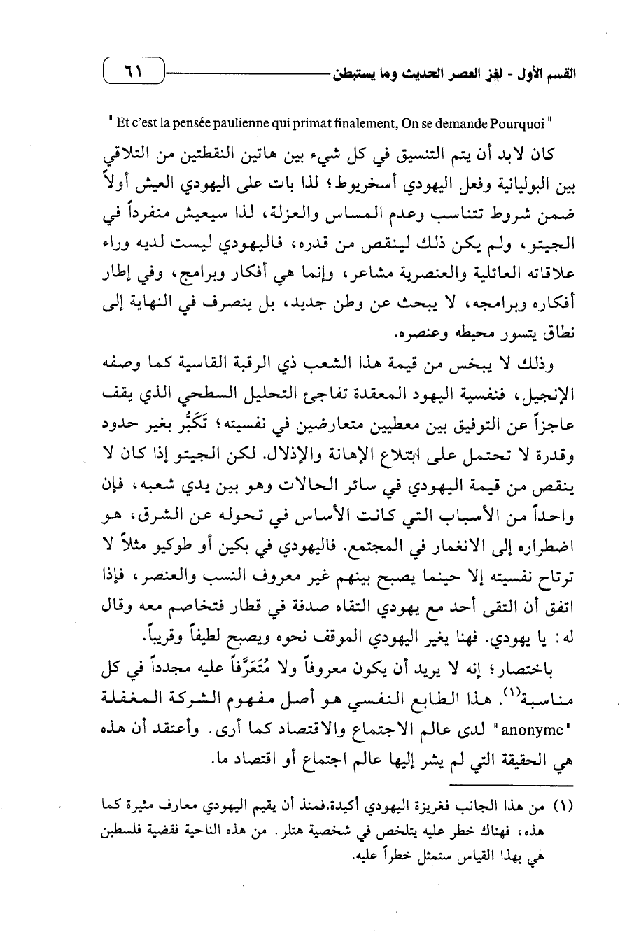 (¬1) من هذا الجانب فغريزة اليهودي أكيدة. فمنذ أن يقيم اليهودي معارف مثيرة كما هذه، فهناك خطر عليه يتلخص في شخصية هتلر. من هذه الناحية فقضية فلسطين هي بهذا القياس ستمثل خطرا عليه.