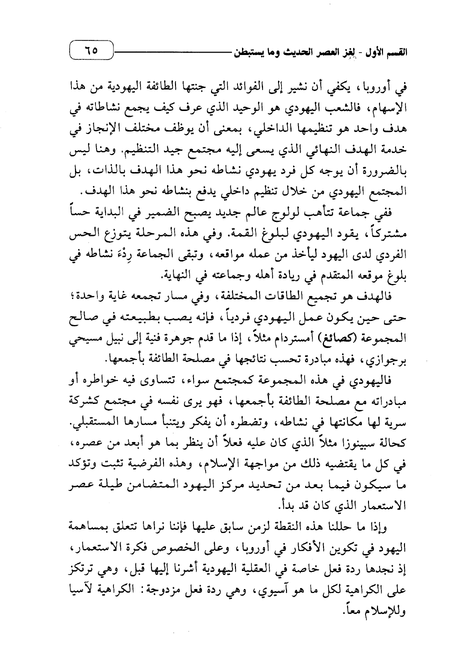 في أوروبا، يكفي أن نشير إلى الفوائد التي جنتها الطائفة اليهودية من هذا الإسهام، فالشعب اليهودي هو الوحيد الذي عرف كيف يجمع نشاطاته في هدف واحد هو تنظيمها الداخلي، بمعنى أن يوظف مختلف الإنجاز في خدمة الهدف النهائي الذي يسعى إليه مجتمع جيد التنظيم. وهنا ليس بالضرورة أن يوجه كل فرد يهودي نشاطه نحو هذا الهدف بالذات، بل المجتمع اليهودي من خلال تنظيم داخلي يدفع بنشاطه نحو هذا الهدف.