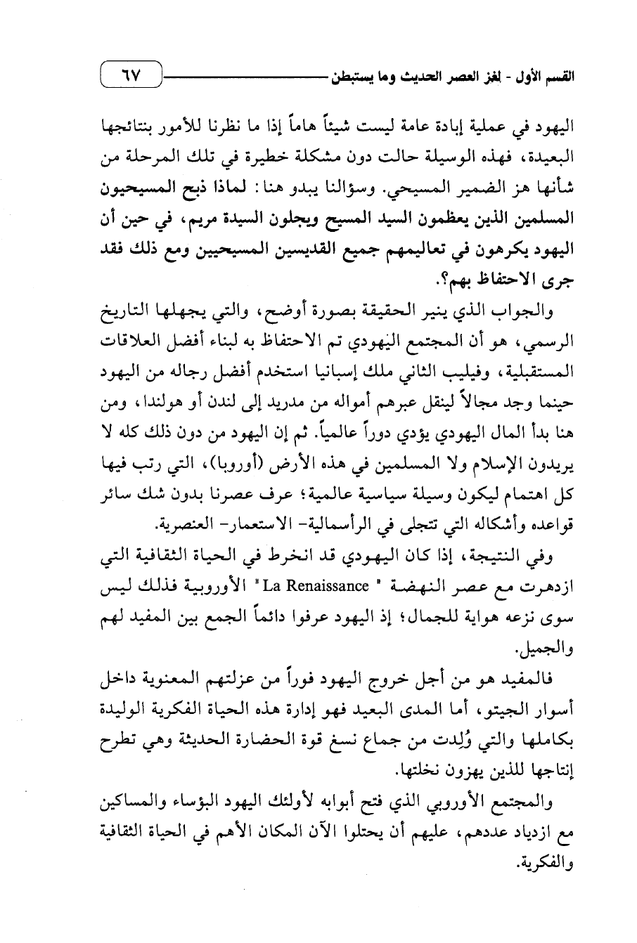 اليهود في عملية إبادة عامة ليست شيئا هاما إذا ما نظرنا للأمور بنتائجها البعيدة، فهذه الوسيلة حالت دون مشكلة خطيرة في تلك المرحلة من شأنها هز الضمير المسيحي. وسؤالنا يبدو هنا: لماذا ذبح المسيحيون المسلمين الذين يعظمون السيد المسيح ويجلون السيدة مريم، في حين أن اليهود يكرهون في تعاليمهم جميع القديسين المسيحيين ومع ذلك فقد جرى الاحتفاظ بهم؟.