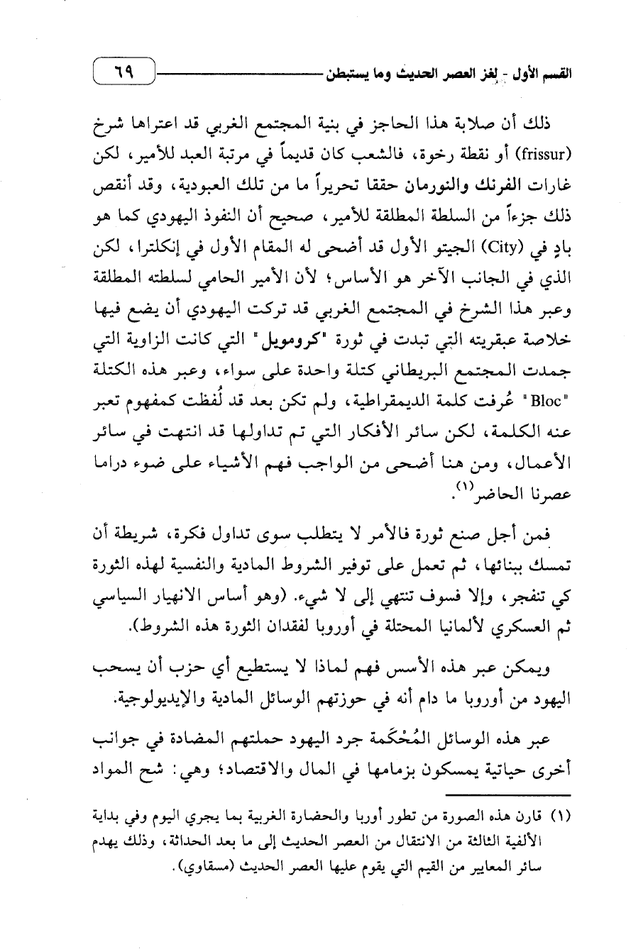ذلك أن صلابة هذا الحاجز في بنية المجتمع الغربي قد اعتراها شرخ (frissur) أو نقطة رخوة، فالشعب كان قديما في مرتبة العبد للأمير، لكن غارات الفرنك والنورمان حققا تحريرا ما من تلك العبودية، وقد أنقص ذلك جزءا من السلطة المطلقة للأمير، صحيح أن النفوذ اليهودي كما هو باد في (City) الجيتو الأول قد أضحى له المقام الأول في إنكلترا، لكن الذي في الجانب الآخر هو الأساس؛ لأن الأمير الحامي لسلطته المطلقة وعبر هذا الشرخ في المجتمع الغربي قد تركت اليهودي أن يضع فيها