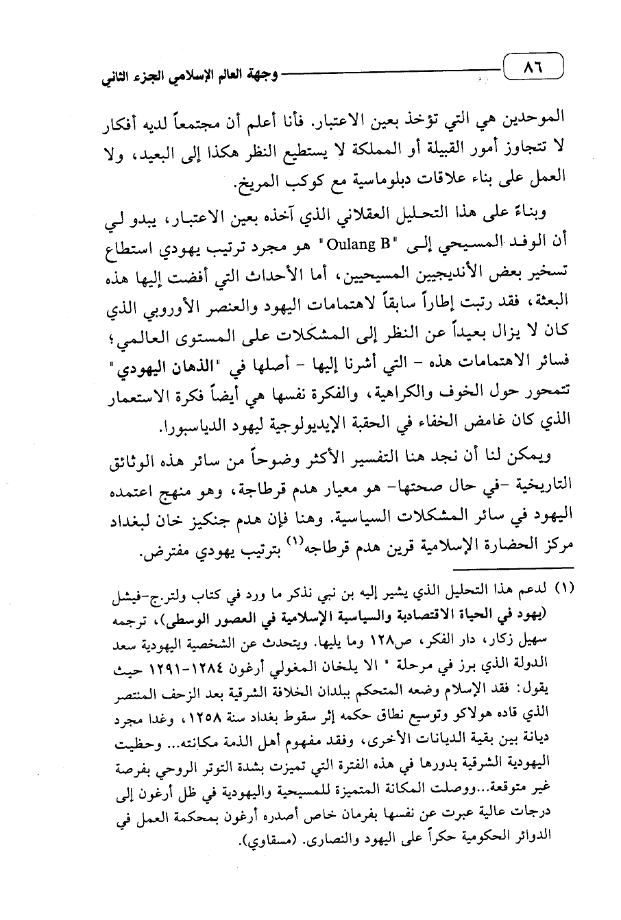 (¬1) لدعم هذا التحليل الذي يشير إليه بن نبي نذكر ما ورد في كتاب ولتر. ج - فيشل (يهود في الحياة الاقتصادية والسياسية الإسلامية في العصور الوسطى)، ترجمه سهيل زكار، دار الفكر، ص 128 وما يليها. ويتحدث عن الثخصية اليهودية سعد الدولة الذي برز في مرحلة (الا يلخان المغولي أرغون 1284 - 1291 حيث يقول: فقد الإسلام وضعه المتحكم ببلدان الخلافة الشرقية بعد الزحف المنتصر الذي قاده هولاكو وتوسيع نطاق حكمه إثر سقوط بغداد سنة 1258، وغدا مجرد ديانة بين بقية الدياذات الأخرى، وفقد مفهوم أهل الذمة مكانته ... وحظيت اليهودية الشرقية بدورها في هذه الفترة التي تميزت بشدة التوتر الروحي بفرصة غير متوقعة ... ووملت المكانة المتميزة للمسيحية واليهودية في ظل أرغون إلى درجات عالية عبرت عن نفسها بفرمان خاص أصدره أرغون بمحكمة العمل في الدوائر الحكومية حكرا على اليهود والنصارى. (مسقاوي).