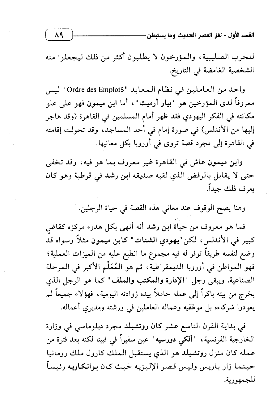 فما هو معروف من حياة ابن رشد أنه أنهى بكل هدوء مركزه كقاض كبير في الأندلس، لكن يهودي الشتات كابن ميمون مثلا وسواه قد وضع لنفسه طريقا توفر له فيه مجموع ما انطبع عليه من الميزات العملية؛ فهو المواطن في أوروبا الديمقراطية، ثم هو المعلم الأكبر في المرحلة الصناعية. ويبقى رجل (الإدارة والمكتب والملف) كما هو الرجل الذي يخرج من بيته باكرا إلى عمله حاملا بيده زوادته اليومية، فهؤلاء جميعا لم يعودوا شركاءه بل موظفيه وعماله العاملين في ورشته ومديري أعماله.