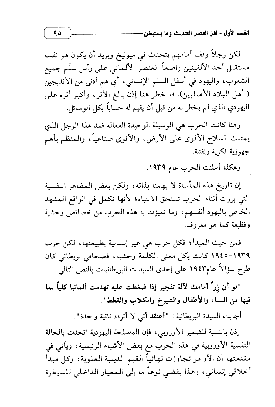 إذن بالنسبة للضمير الأوروبي، فإن المصلحة اليهودية اتحدت بالحالة النفسية الأوروبية في هذه الحرب مع بعض الأشياء الرئيسية، ويأتي في مقدمتها أن الأوامر تجاوزت نهائيا القيم الدينية العلوية، وكل مبدأ أخلاقي إنساني، وهذا يفضي نوعا ما إلى المعيار الداخلي للسيطرة