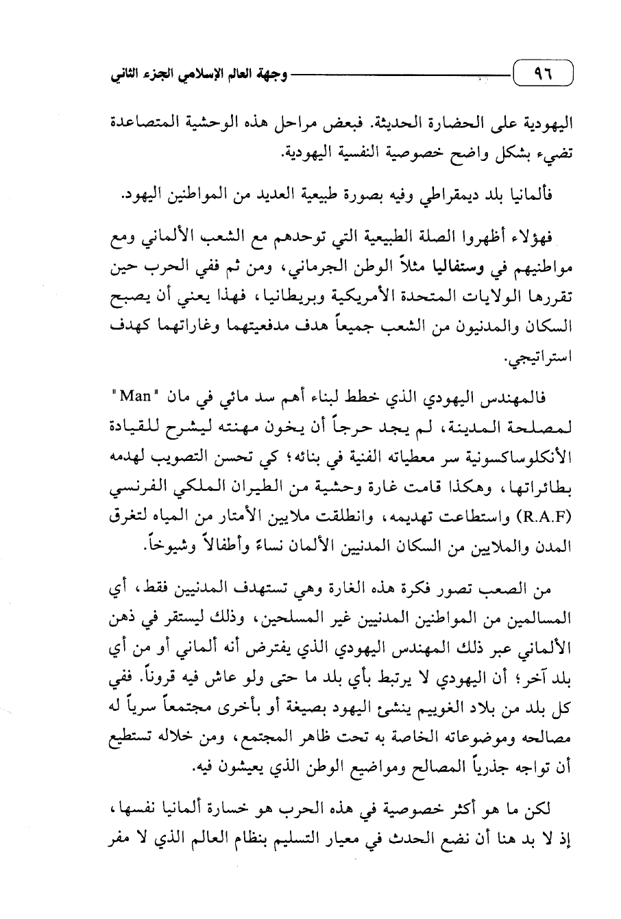 فالمهندس اليهودي الذي خطط لبناء أهم سد مائي في مان (Man) لمصلحة المدينة، لم يجد حرجا أن يخون مهنته ليشرح للقيادة الأنكلوساكسونية سر معطياته الفنية في بنائه؛ كي تحسن التصويب لهدمه بطائراتها، وهكذا قامت غارة وحشية من الطيران الملكي الفرنسي (R.A.F) واستطاعت تهديمه، وانطلقت ملايين الأمتار من المياه لتغرق المدن والملايين من السكان المدنيين الألمان نساء وأطفالا وشيوخا.