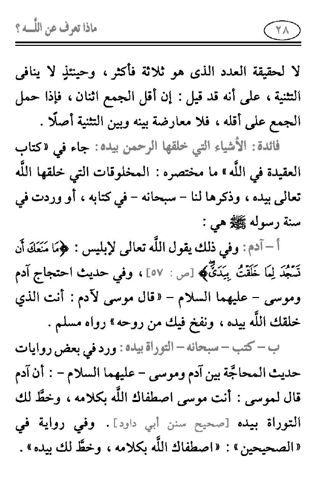 ب- كتب- سبحانه- التوواة بيده: ورد في بعض روايات حديث المحاجَّة بين آدم وموسى -عليهما السلام-: أن آدم قال لموسى: "أَنْتَ مُوسَى اصْطَفَاكَ اللَّهُ بِكَلَامِهِ وَخَطَّ لَكَ التَّوْرَاةَ بِيَدِهِ" [صحيح سنن أبي داود]. وفي رواية في "الصحيحين": "اصْطَفَاكَ اللهُ بِكَلَامِهِ، وَخَطَّ لَكَ بِيَدِهِ".