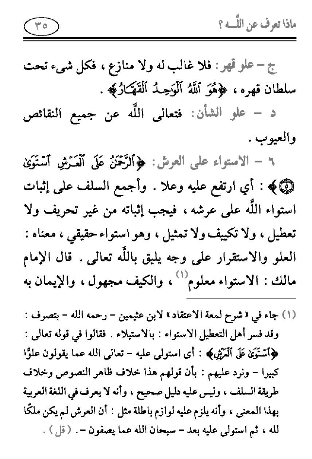 6 - الاستواء على العرش: {الرَّحْمَنُ عَلَى الْعَرْشِ اسْتَوَى (5)} [طه] أي: ارتفع عليه وعلا. وأجمع السلف على إثبات استواء الله على عرشه، فيجب إثباته من غير تحريف ولا تعطيل، ولا تكييف ولا تمثيل، وهو استواء حقيقي، معناه: العلو والاستقرار على وجه يليق بالله تعالى.