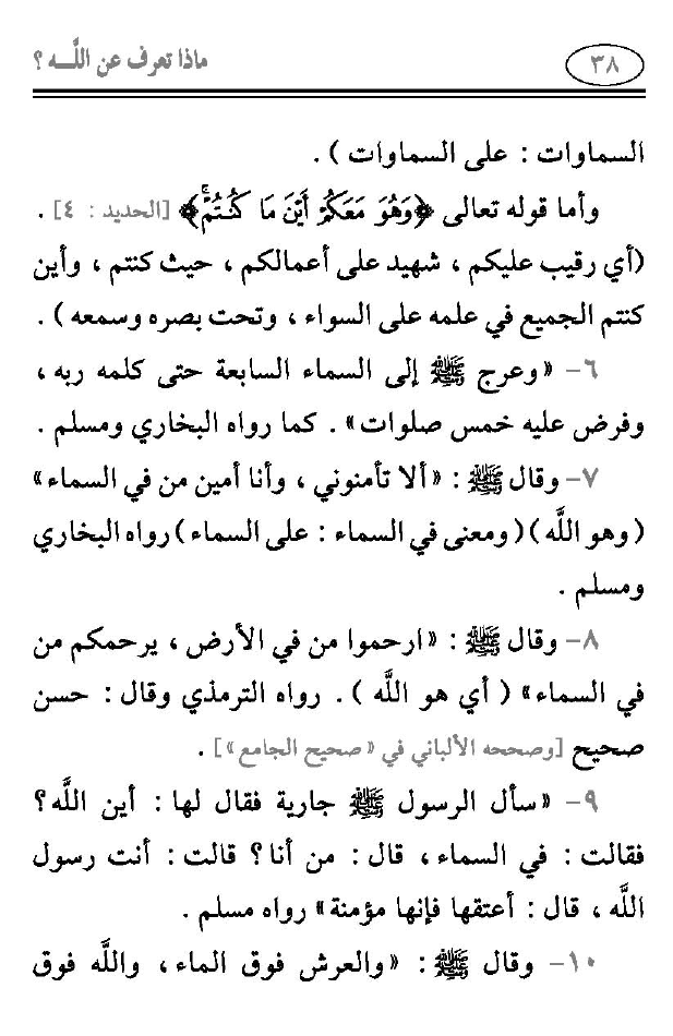 9 - سأل الرسول - صلى الله عليه وسلم - جارية فقال لها: «أَيْنَ اللهُ؟» قَالَتْ: فِي السَّمَاءِ، قَالَ: «مَنْ أَنَا؟» قَالَتْ: أَنْتَ رَسُولُ اللهِ، قَالَ: «أَعْتِقْهَا، فَإِنَّهَا مُؤْمِنَةٌ» [رواه مسلم].