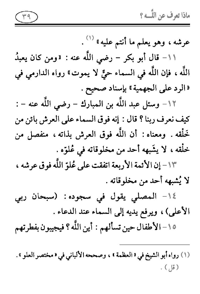 12 - وسئل عبد الله بن المبارك -رضي الله عنه-: كيف نعرف ربنا؟ قال: إنه فوق السماء على العرش بائن من خَلْقه. ومعناه: أن الله فوق العرش بذاته، منفصل من خَلْقه، لا يشَبهه أحد من مخلوقاته في عُلوّه.