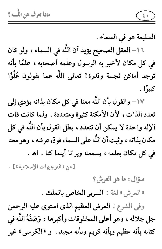 17 - والقول بأن الله معنا في كل مكان بذاته يؤدي إلى تعدد الذات، لأن الأمكنة كثيرة ومتعددة. ولما كانت ذات الإله واحدة لا يمكن أن تتعدد، بطل القول بأن الله في كل مكان بذاته، وثبت أن الله على السماء فوق عرشه، وهو معنا في كل مكان بعلمه، يسمعنا ويرانا أينما كنا. اهـ. [من "التوجيهات الإسلامية"].