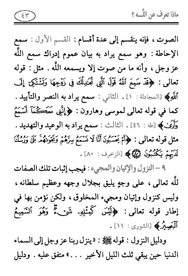 9 - النزول والإتيان والمجيء: فيجب إثبات تلك الصفات لله تعالى، على وجهٍ يليق بجلال وجهه وعظيم سلطانه، وليس كنزول وإتيان ومجيء المخلوق، ولكن نؤمن بها في إطار قوله تعالى: {لَيْسَ كَمِثْلِهِ شَيْءٌ وَهُوَ السَّمِيعُ الْبَصِيرُ (11)} [الشورى].
