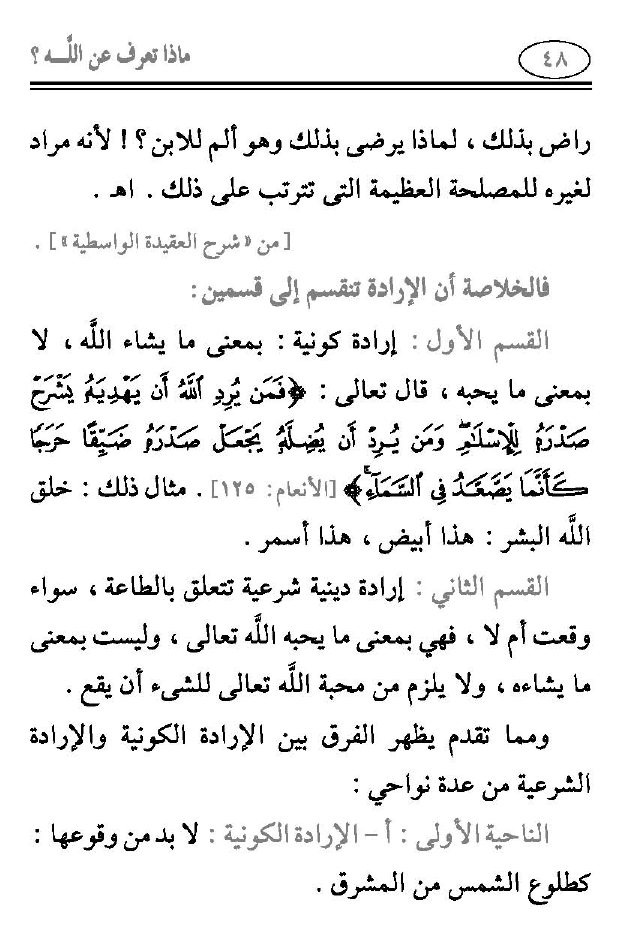 القسم الأول: إرادة كونية: بمعنى ما يشاء الله، لا بمعنى ما يحبه، قال تعالى: {فَمَنْ يُرِدِ اللَّهُ أَنْ يَهْدِيَهُ يَشْرَحْ صَدْرَهُ لِلْإِسْلَامِ وَمَنْ يُرِدْ أَنْ يُضِلَّهُ يَجْعَلْ صَدْرَهُ ضَيِّقًا حَرَجًا كَأَنَّمَا يَصَّعَّدُ فِي السَّمَاءِ} [الأنعام: 125]. مثال ذلك: خلق الله البشر: هذا أبيض، هذا أسمر.