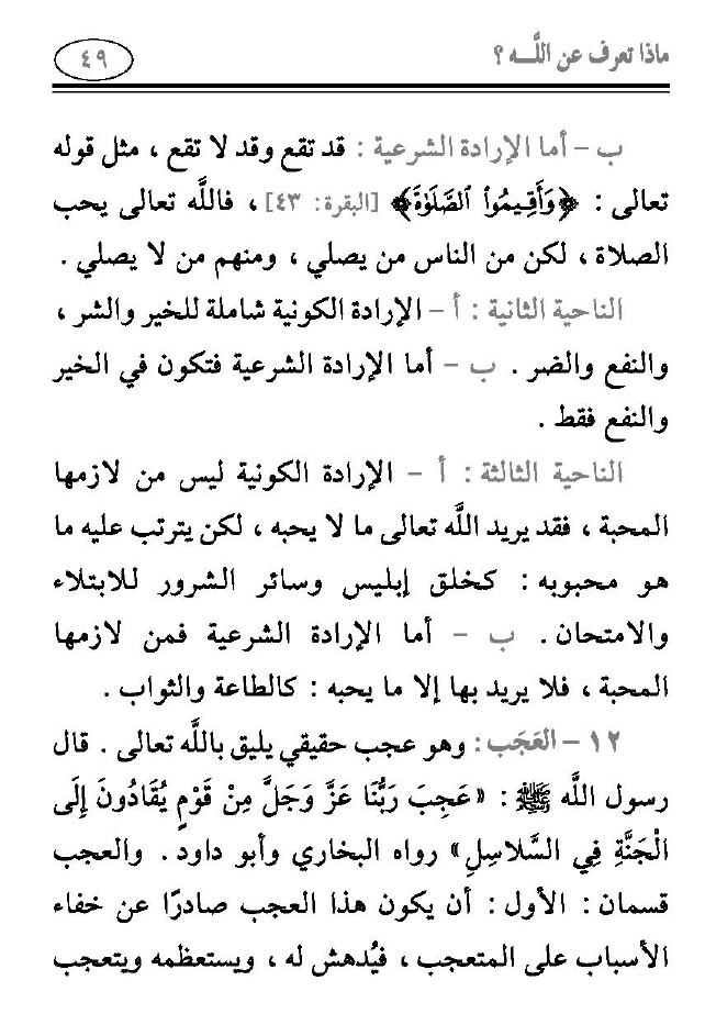 ب- أما الإرادة الشرعية. قد تقع وقد لا تقع، مثل قوله تعالى: {وَأَقِيمُوا الصَّلَاةَ} [البقرة: 43]، فالله تعالى يحب الصلاة، لكن من الناس من يصلي، ومنهم من لا يصلي.