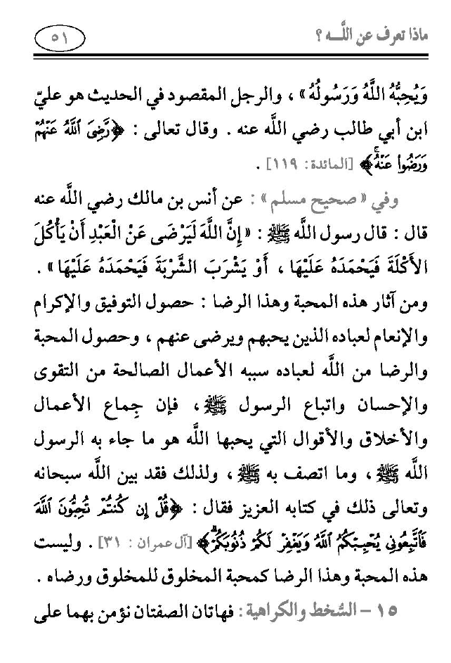وَيُحِبُّهُ اللَّهُ وَرَسُولُهُ»، والرجل المقصود في الحديث هو عليّ ابن أبي طالب رضي الله عنه. وقال تعالى: {رَضِيَ اللَّهُ عَنْهُمْ وَرَضُوا عَنْهُ} [المائدة: 119].