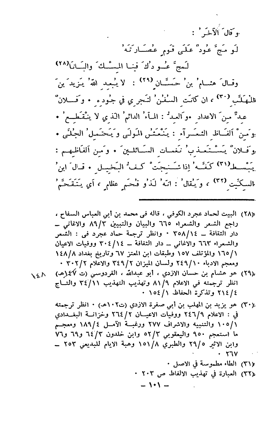 وقال هشام بن حسان: لا يُبعِدِ اللهُ يزيدَ بن المهلب، إن كانت السفنُ لتجري في جوده. وفلان عِدٌّ من الأعداد. والعِدُّ: الماء الدائم الذي لا ينقطع. ومن ألفاظ الشعراء: ينعَش المولى ويحتمل الجُلَّى. وفلان يستعذب نَغَمات السائلين. ومن ألفاظهم: يبسط كفه إذا شنِجت كفُّ البخيل. قال ابن السكيت: ويقال: إنه لذو قُحَم عظام، أي يقتحَّم