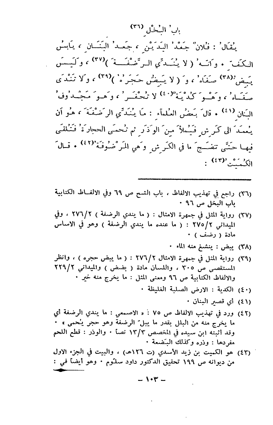 يقال: فلان جَعْدُ اليدين، جعد البنان، يابس الكف. وإنه لا يندِّي الرضفة، وليس يَبِضُّ صَفَاه ولا يبض حَجَرُه، ولا تندى صفاه، وهو كُدْية لا تُحفر، وهو مجدوف البنان. قال بعض العلماء: ما يُندِّي الرضفة، هو أن يُعمَدَ إلى كرِش فيُملأ من الوذَر ثم تُحمى الحجارة فتلقى فيها حتى تنضَجَ ما في الكرش وهي المرضوفة. قال الكميت: