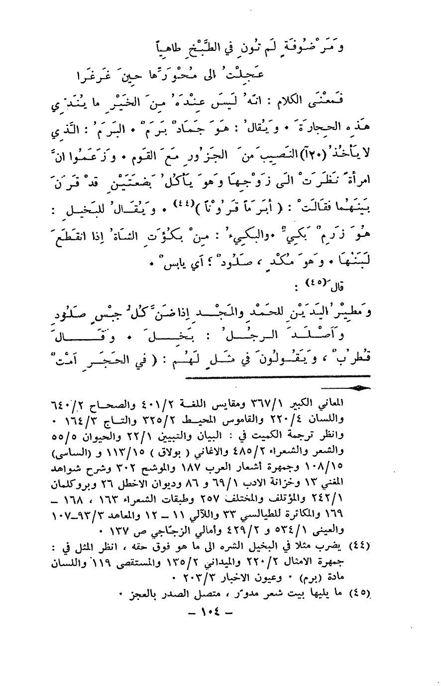 فمعنى الكلام: أنه ليس عنده من الخير ما يندِّي هذه الحجارة. ويقال: هو جَمادٌ بَرَم. البَرَم: الذي لا يأخذ النصيب من الجزور مع القوم. وزعموا أن امرأة نظرت إلى زوجها وهو يأكل بَضْعتين قد قرن بينهما فقالت: أبَرَما قَرونا. ويقال للبخيل: هو زَرِم بكيٌّ. والبكيء: من بكُؤَت الشاة إذا انقطع لبنها. وهو مُكْدٍ صلود أي يابس.