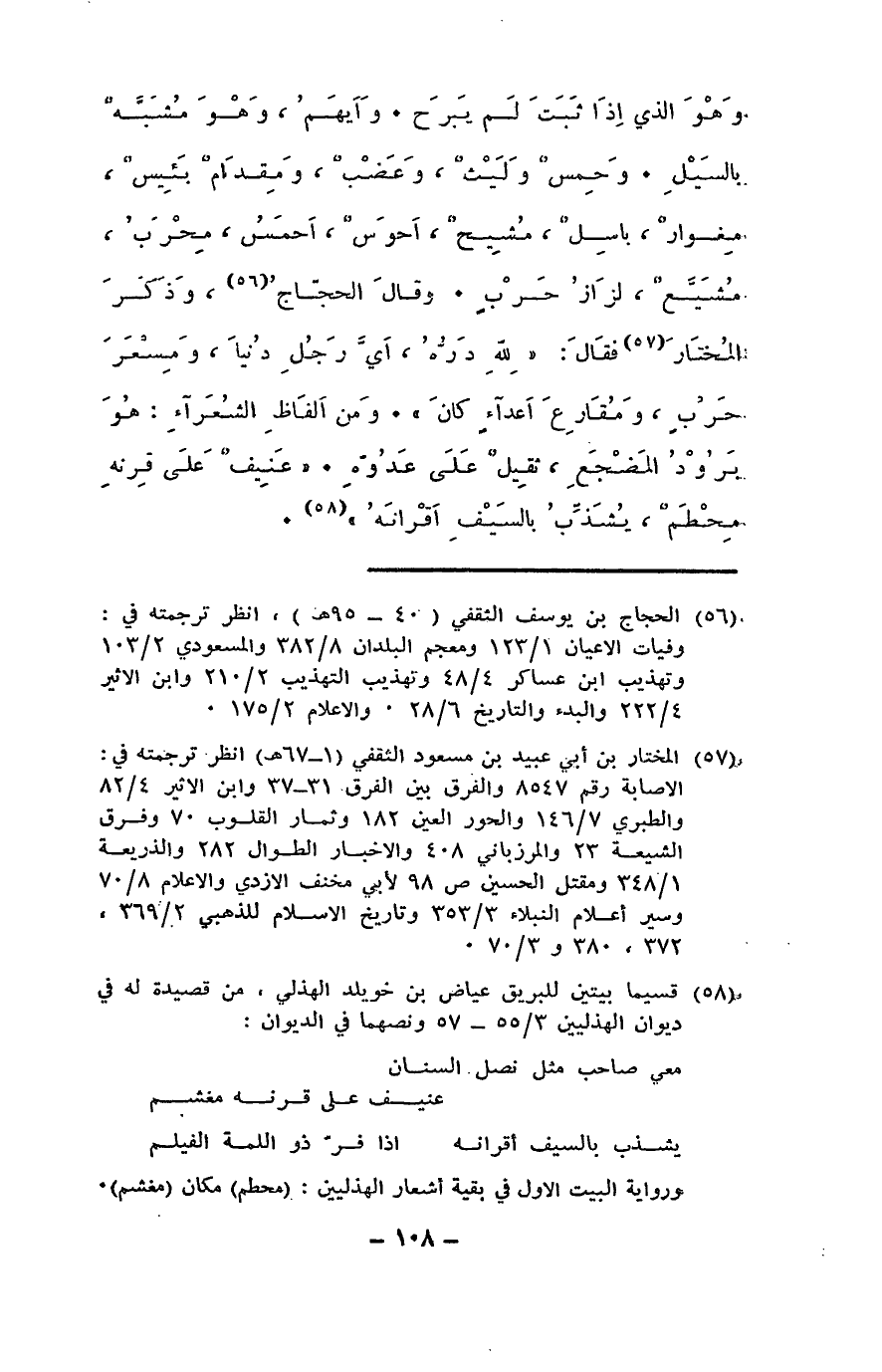 وهو الذي إذا ثبت لم يبرح. وأيهم، وهو مشبَّه بالسيل. وحَمِس وليث، وعَضْب، ومقدام بَئيس، مغوار، باسل، مُشيح، أحوس، أحمس، مِحرَب، مشيَّع، لِزازُ حرب. وقال الحجاج، وذكر المختار فقال: لله دره، أيَّ رجلِ دنيا ومسعرِ [ضبطه المحقق بالفتح] حرب، ومقارعِ [ضبطه المحقق بالفتح] أعداءٍ كان. ومن ألفاظ الشعراء: هو بَرودُ المضجعِ، ثقيلٌ على عدوه. عنيف على قِرْنه، مِحطَم، يشذِّب بالسيف أقرانَه.