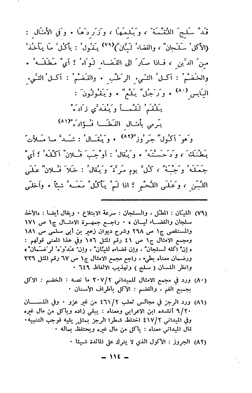 قد سلِجَ اللقمةَ وبلِعها، وزرِدها. وفي الأمثال: الأكل سلجان، والقضاء لَيَّان. يقول: يأكل ما يأخذ من الدين، فإذا صار إلى القضاء لواه؛ أي مطله. والخَضْم: أكل الشيء الرطب، والقضم: أكل الشيء اليابس. ورجل بَلْع. ويقولون: