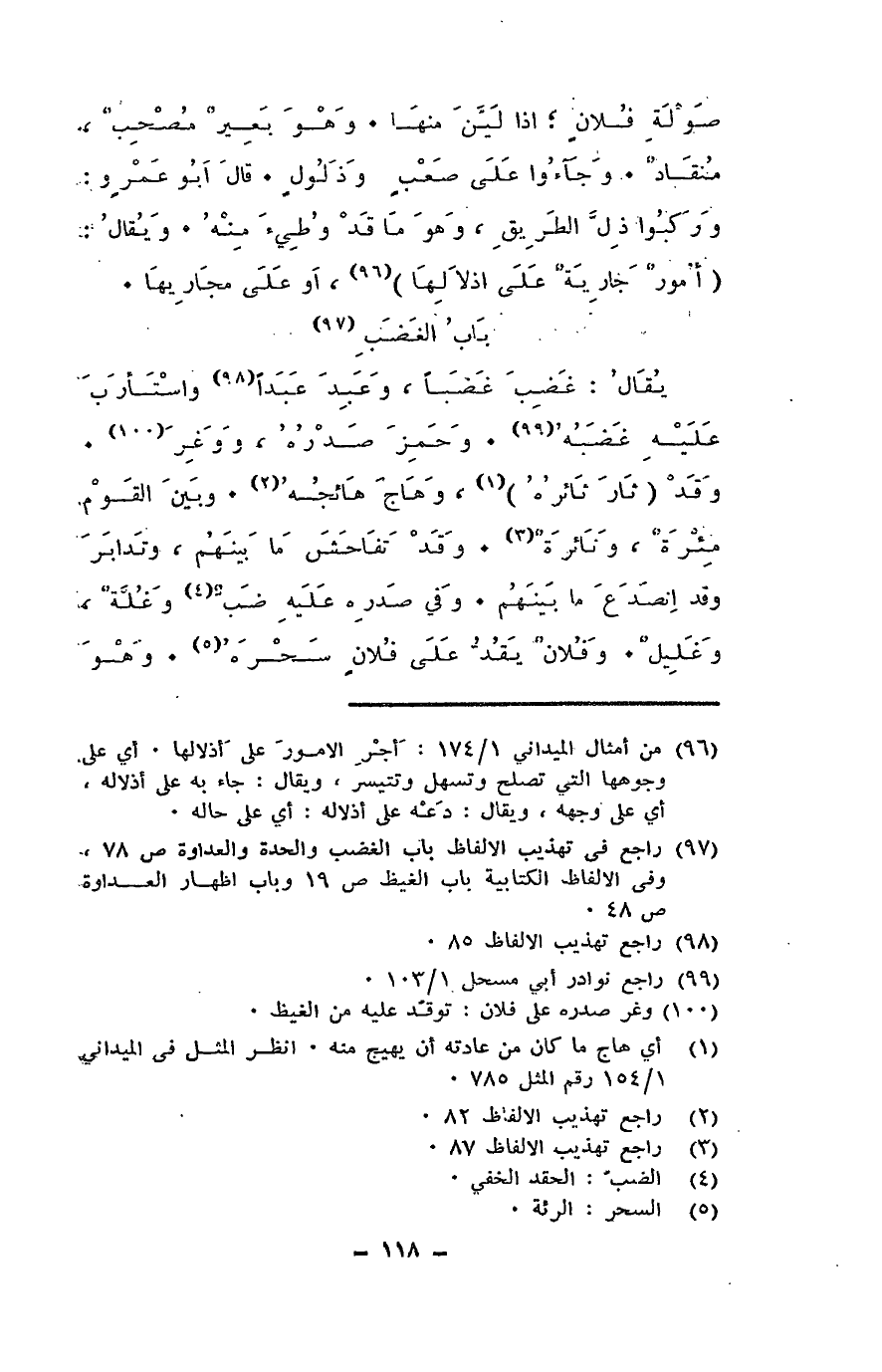 يقال غضب غضبا، وعبِد عبَدا، واستأرب عليه غضبُه. وحمِزَ صدرُه، ووغِر. وقد ثار ثائرُه، وهاج هائجه. وبين القوم مِئرة، ونائرة. وقد تفاحش ما بينهم، وتدابر، وقد انصدع ما بينهم. وفي صدره عليه ضَبّ [ينظر الحيوان للجاحظ] وغُلة، وغليل. وفلان يقُد على فلان سَحرَه. وهو