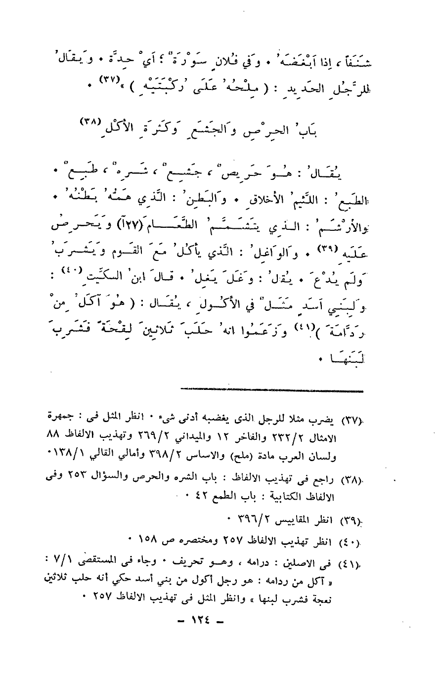 يقال هو حريص جشع شره طبع. الطبع اللئيم الأخلاق. والبطن الذي همه بطنه. والأرشم الذي يتشمم الطعام ويحرص عليه. والواغل الذي يأكل مع القوم ويشرب ولم يُدع. يقال: وغَل يغِل. قال ابن السكيت: ولبني أسد مثل في الأكول، يقال: هو آكَل من رَدَّامة، وزعموا أنه حلب ثلاثين لِقحة فشرب لبنها.